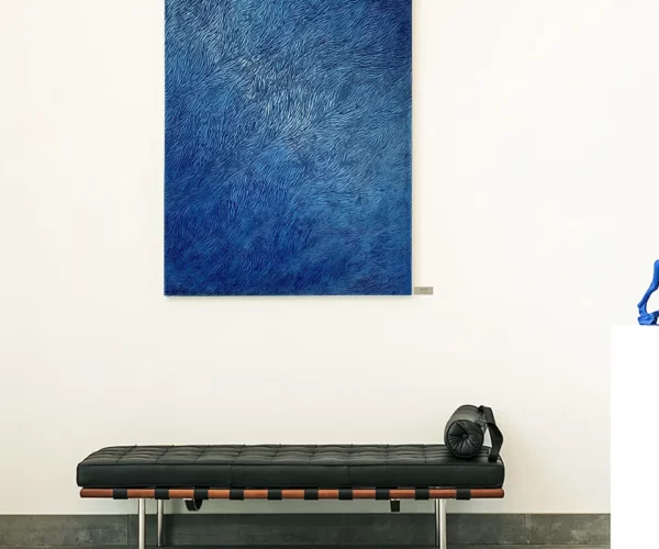 Cette commande sur mesure a nécessité un travail long et minutieux pour le cintrage et l’assemblage en serti invisible du laiton. Le dos de l’œuvre a été laqué sur demande spécifique afin de préserver l’harmonie de couleur de l’œuvre.